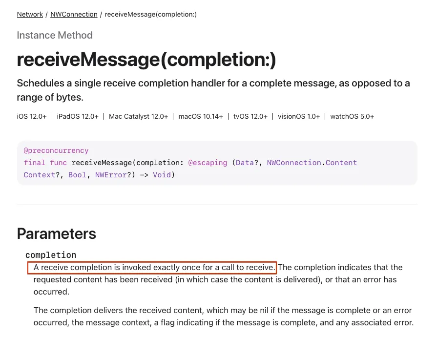 위의 예시는 NWConnection.receiveMessage(completion: )문서의 내용이다.